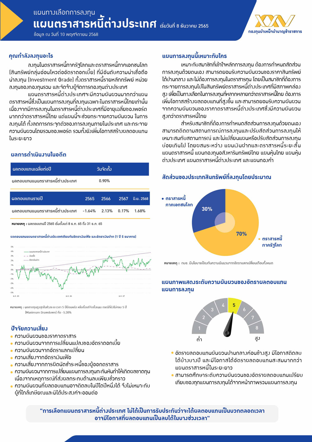 เป็นแผนที่ลงทุนในตราสารหนี้ภาครัฐโลกและตราสารหนี้ภาคเอกชนโลกที่มีอันดับความน่าเชื่อถือน่าลงทุน (Investment Grade) ทั้งตราสารหนี้รายหลักทรัพย์ หน่วยลงทุนของกองทุนรวม และจัดจ้างผู้จัดการกองทุนต่างประเทศ แผนตราสารหนี้ต่างประเทศมีระดับความเสี่ยงปานกลางค่อนข้างสูง ช่วยกระจายความเสี่ยงการลงทุนได้ ทั้งลดการกระจุกตัวของการลงทุนภายในประเทศ และกระจายความเสี่ยงโดยรวมของพอร์ต รวมทั้งยังเพิ่มโอกาสสร้างผลตอบแทนในระยะยาว