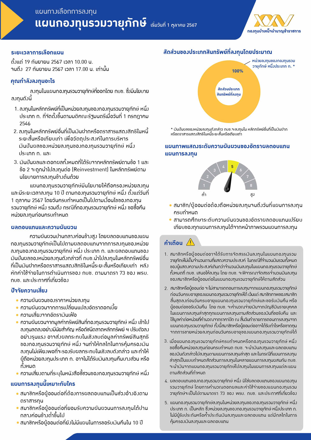 ความเสี่ยงปานกลางค่อนข้างสูง โดยผลตอบแทนของแผนกองทุนรวมวายุภักษ์เป็นไปตามผลตอบแทนจากการลงทุนของหน่วยลงทุนของกองทุนรวมวายุภักษ์ หนึ่ง ประเภท ก. และผลตอบแทนของเงินปันผลของหน่วยลงทุนดังกล่าวที่ กบข. นำไปลงทุนในหลักทรัพย์อื่น ที่เป็นเงินฝากหรือตราสารแสดงสิทธิในหนี้ระยะสั้นหรือเทียบเท่า หลังหักค่าใช้จ่ายในการดำเนินการของ กบข. ตามมาตรา 73 ของ พรบ. กบข. และประกาศที่เกี่ยวข้อง