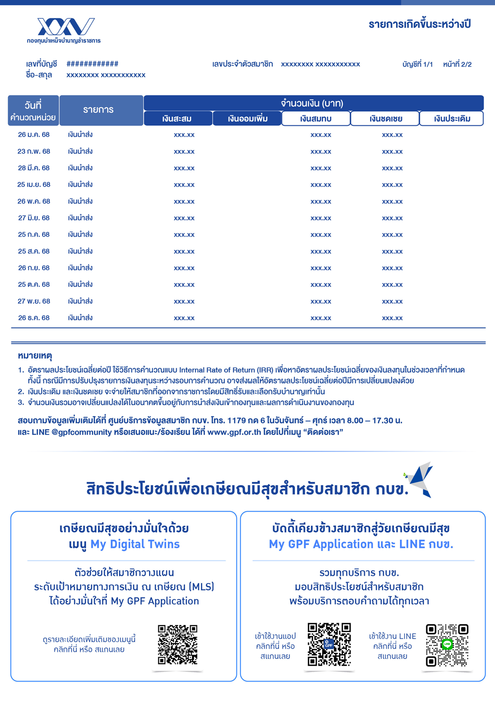 ได้ที่ช่องทาง GPF Community และติดต่อสอบถามข้อมูลเกี่ยวกับใบแจ้งยอดเงินได้โดยตรง
