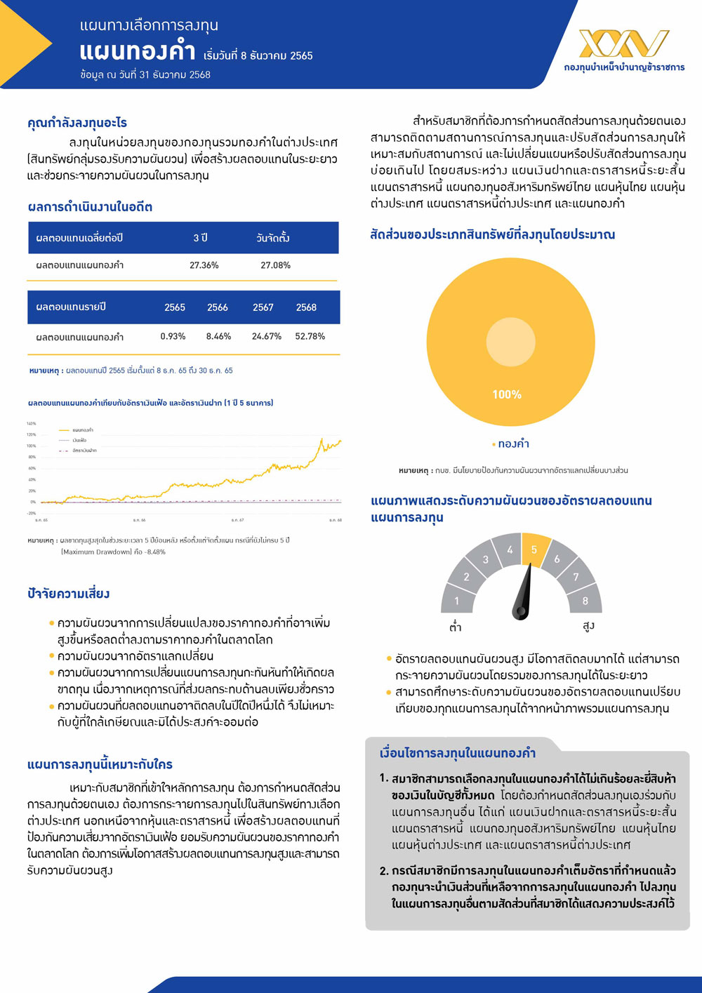 เหมาะกับสมาชิกที่เข้าใจหลักการลงทุน ต้องการกำหนดสัดส่วนการลงทุนด้วยตนเอง กระจายการลงทุนไปในสินทรัพย์ทางเลือกต่างประเทศ นอกเหนือจากหุ้นและตราสารหนี้ เพื่อสร้างผลตอบแทนที่ป้องกันความเสี่ยงจากอัตราเงินเฟ้อ ยอมรับความเสี่ยงจากความผันผวนของราคาทองคำในตลาดโลก ต้องการเพิ่มโอกาสสร้างผลตอบแทนการลงทุนสูง และสามารถรับความเสี่ยงสูงได้